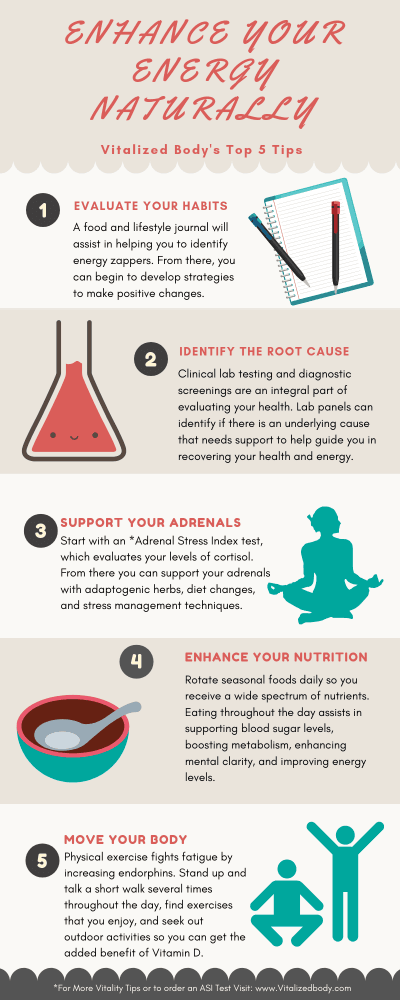 The most valuable place to start with addressing your fatigue is to identify the underlying cause. It is critical to look at all aspects of your health and lifestyle. Some areas of consideration are chronic stress, sleep disturbances, excessive caffeine intake, dehydration, and nutritional deficiencies.